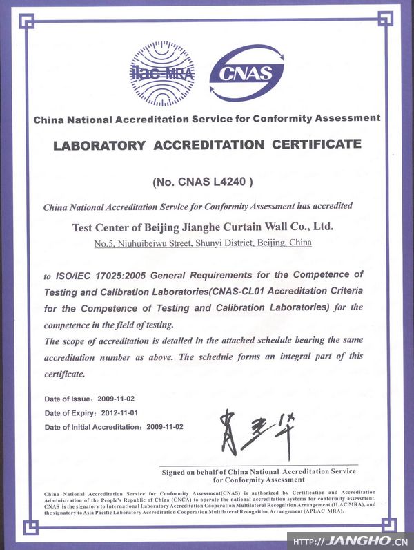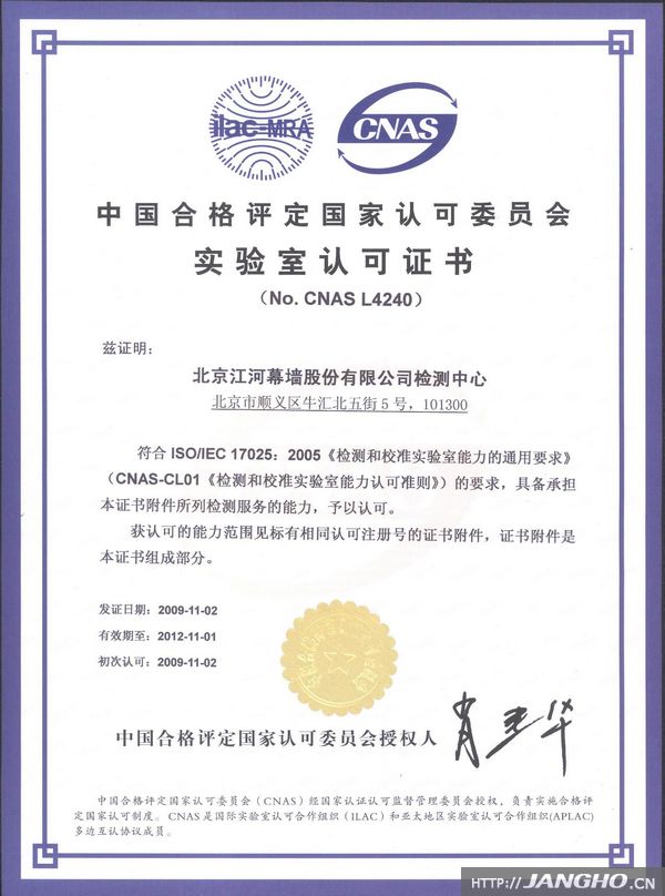 18新利幕墙检测中心正式获得CNAS实验室资质认可证书——成为行业首家通过评审并列入国家获准实验室认可机构名录的幕墙企业